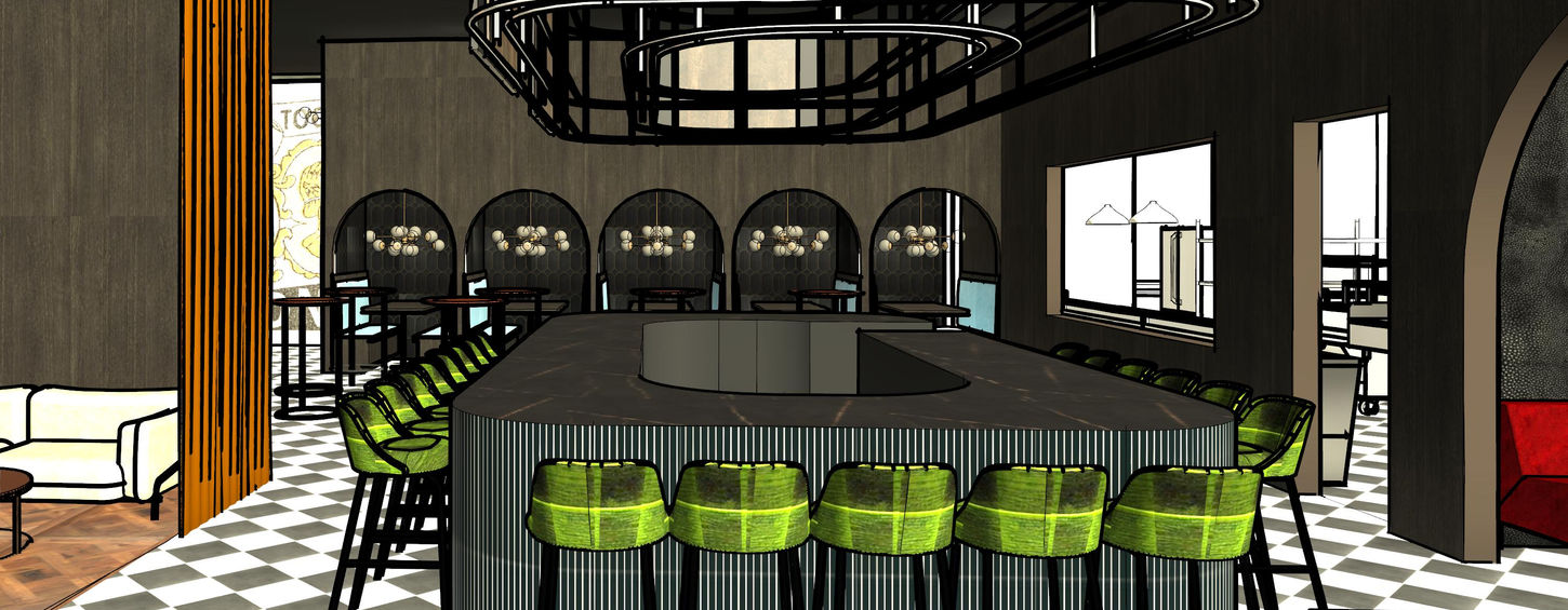 The Black Market Distillery offers a dynamic blend of craft distilling, hospitality, and retail in a series of uniquely designed spaces. At its heart is the central oval-shaped bar, surrounded by standing tables and exuding an Art Deco-inspired speakeasy vibe with moody tones and playful accents. The lounge, positioned at the entrance, serves as a versatile waiting or private space, enclosed by velvet curtains for an intimate atmosphere. The restaurant features cozy, private booths oriented toward the bar and kitchen viewing window, while the merch shop, hidden behind a bookcase door, extends the rustic aesthetic of the tasting lounge. Guests enjoy an immersive journey through six brand-inspired experience rooms, culminating in a Western tavern-style tasting lounge overlooking the industrial distillery, which doubles as overflow seating for large parties. Each space is thoughtfully designed to create a cohesive and memorable guest experience.